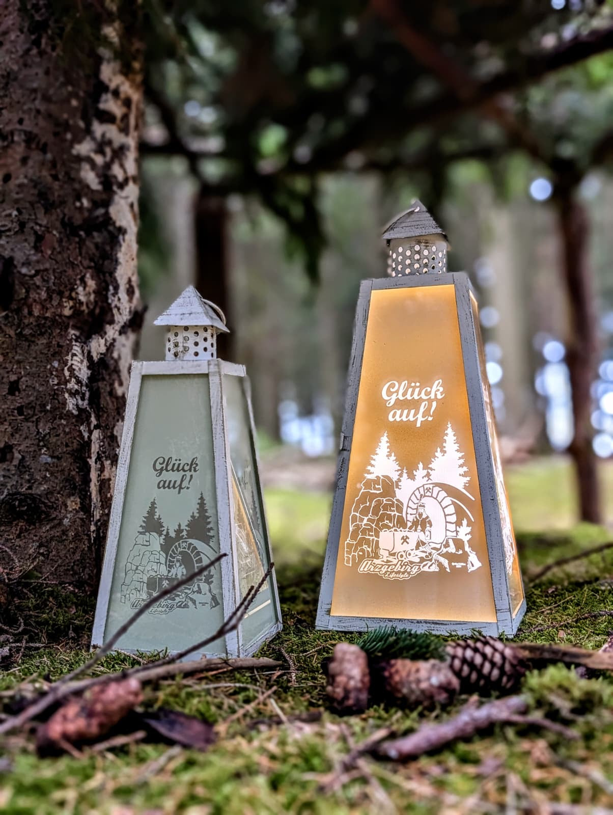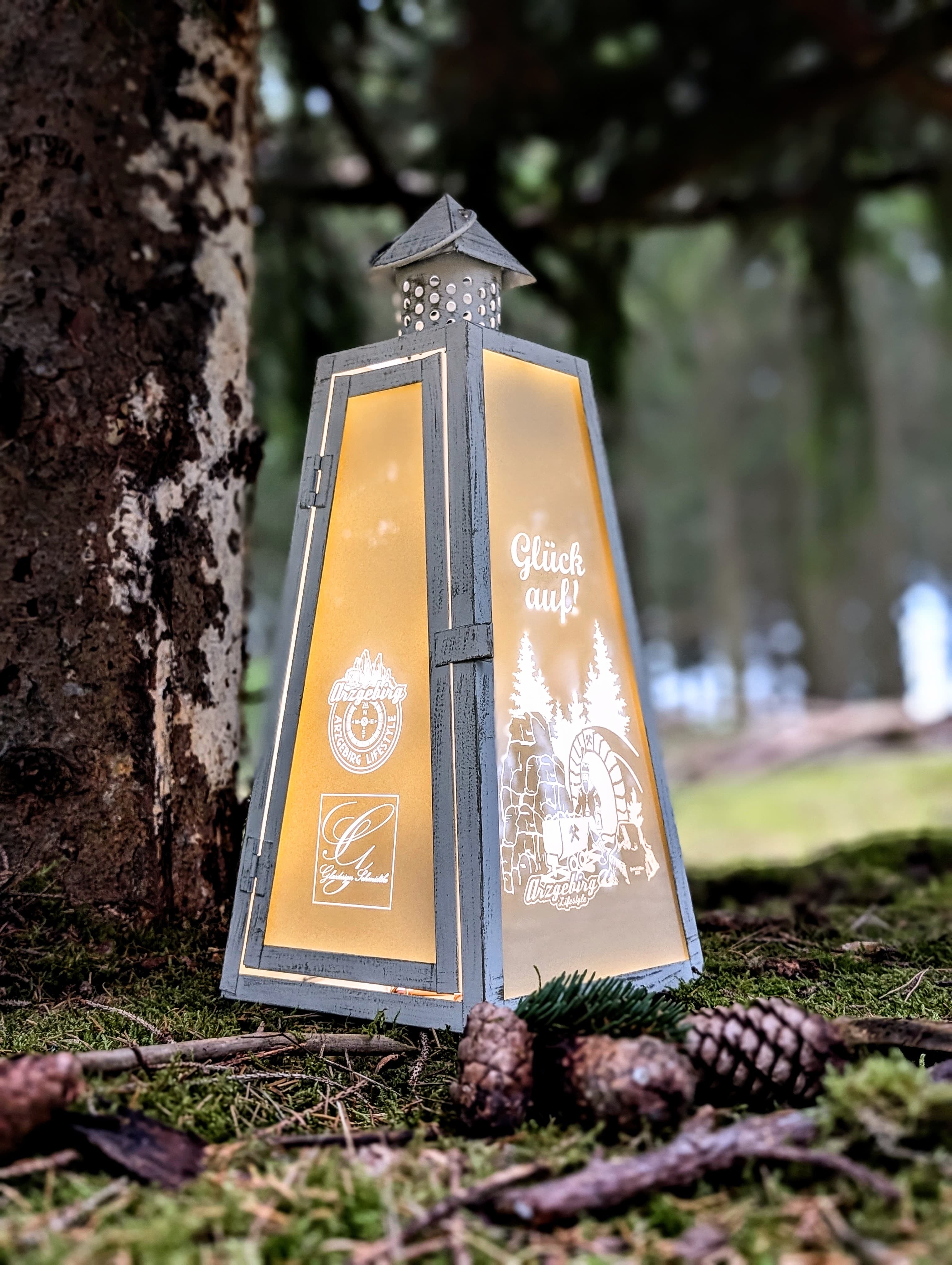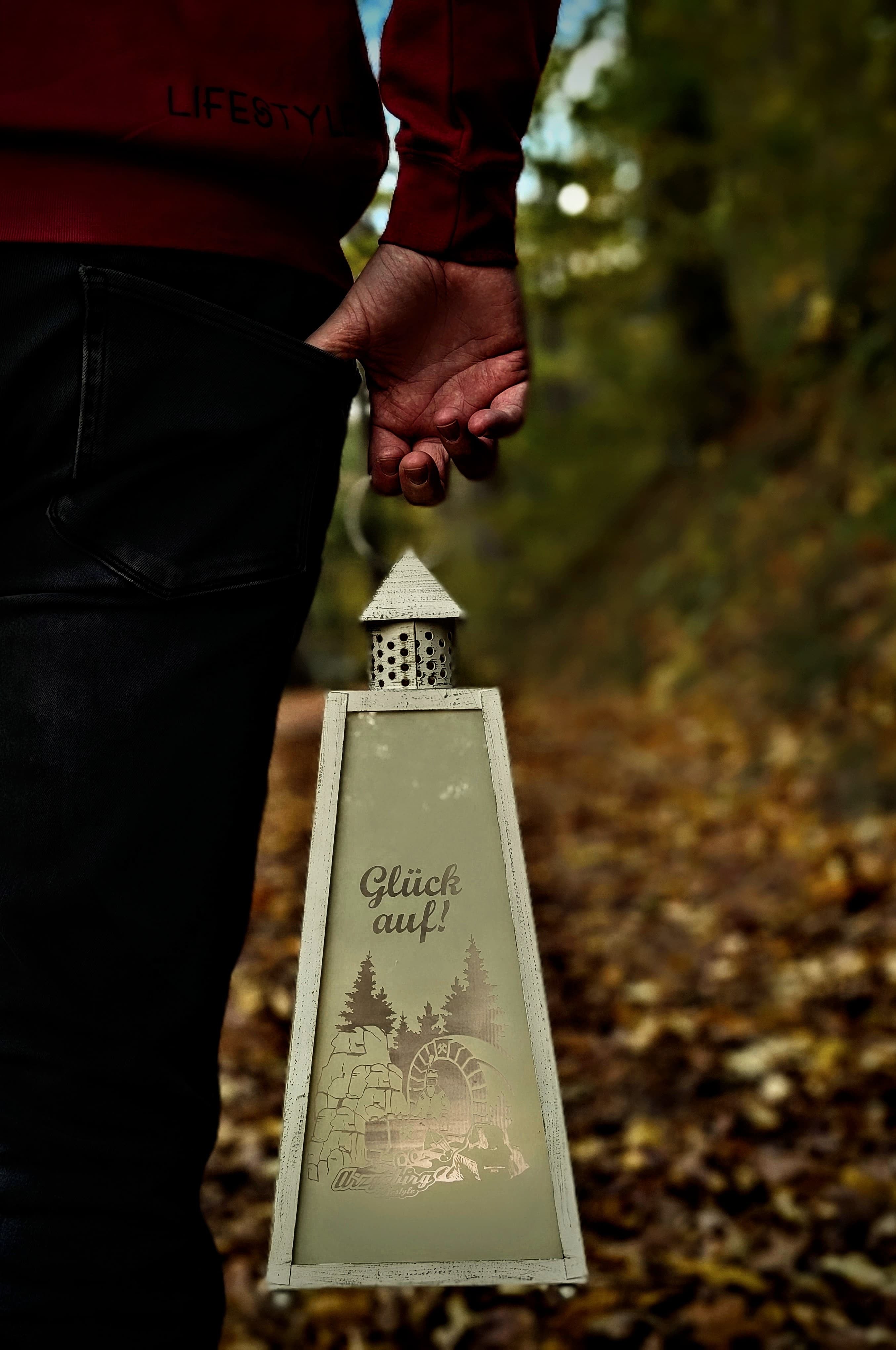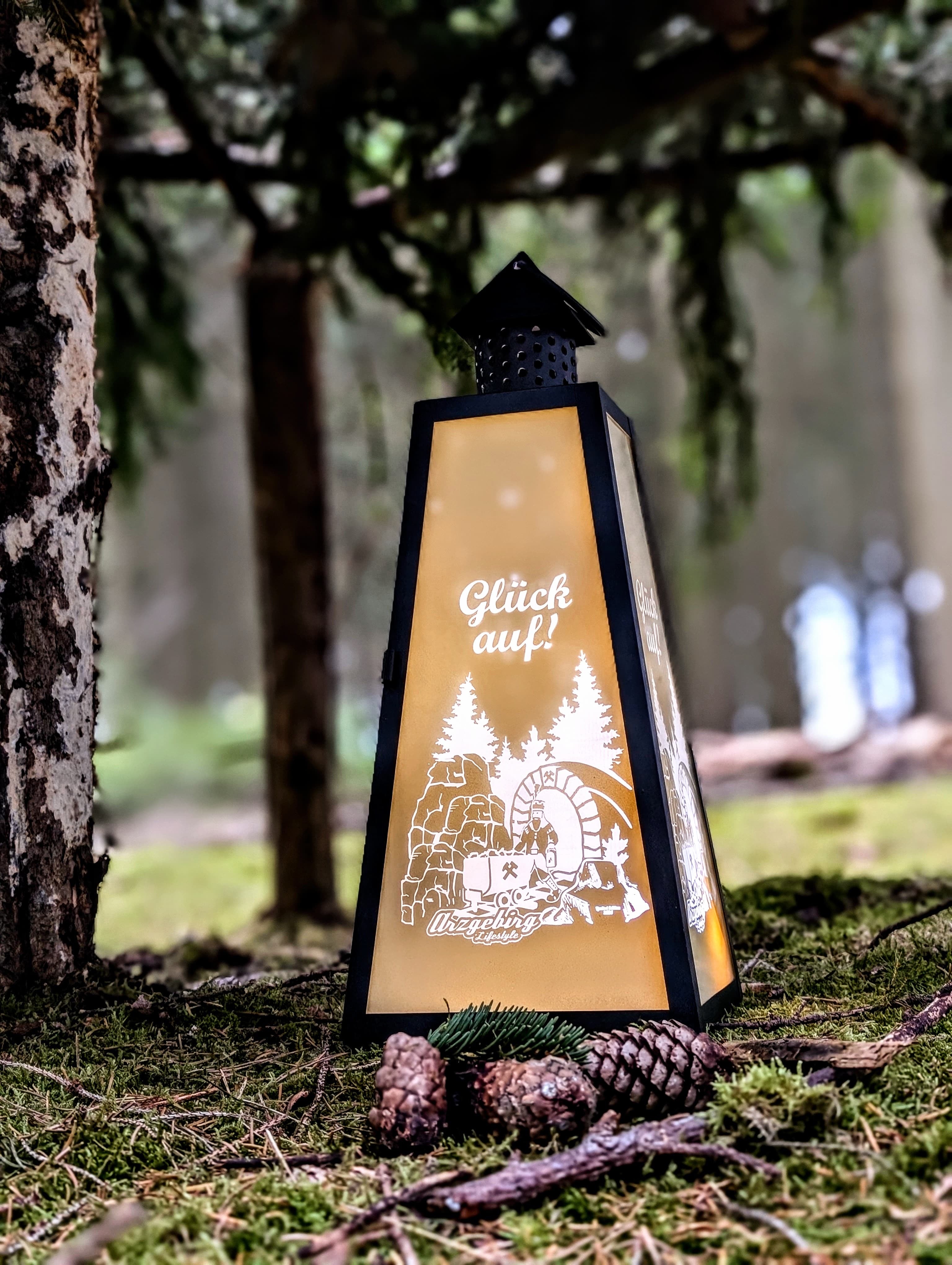 Stilvolle und liebevoll gestaltete Laterne von ArzgebirgLifestyle im Motiv "Glück Auf".